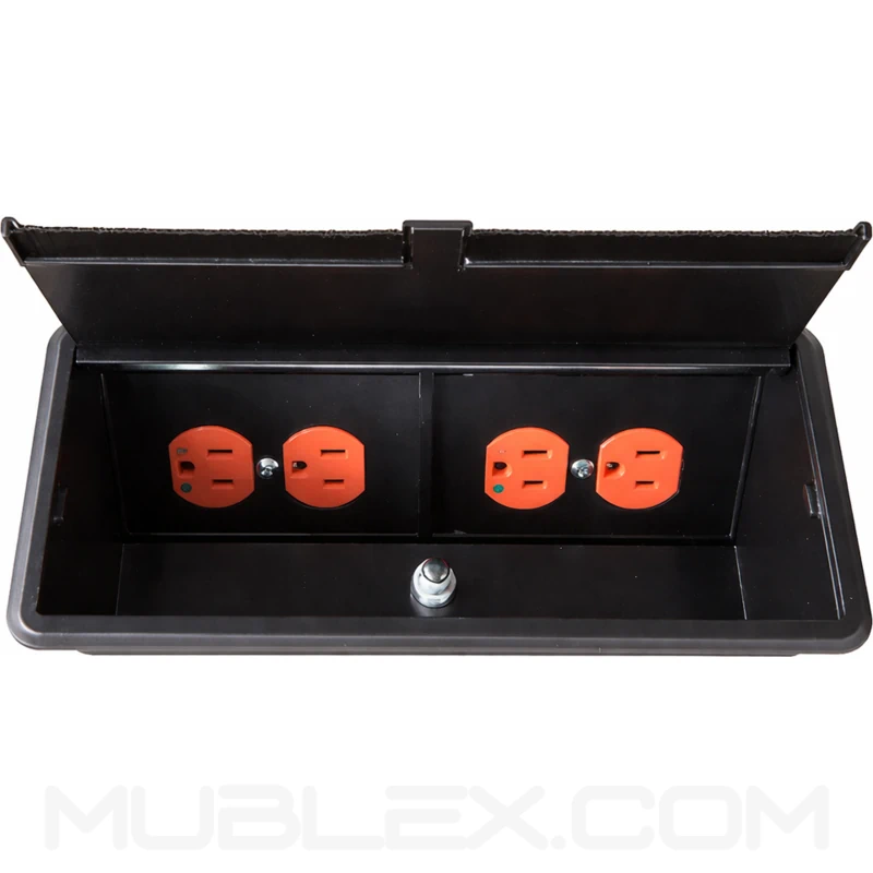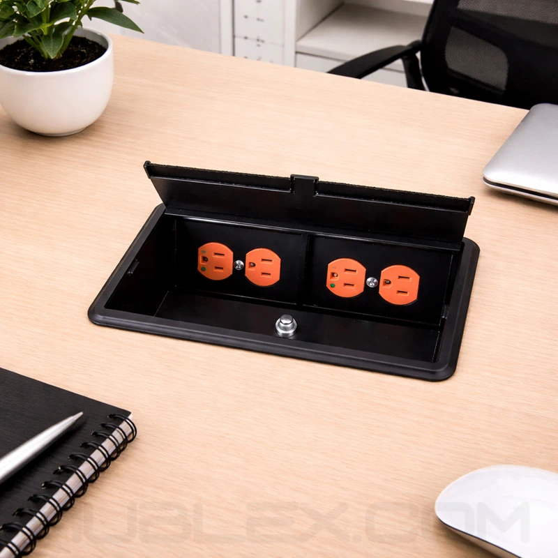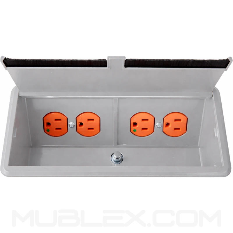Caja multitoma doble de incrustar diseñada para mesas de juntas, escritorios y espacios corporativos que requieren integración eléctrica y de conectividad en superficie, facilitando el acceso ordenado a conexiones sin afectar la estética del mobiliario. Su sistema de apertura push, pasacables con cepillo y fijación adaptable al espesor de la superficie optimizan la funcionalidad y el uso continuo en entornos de trabajo.