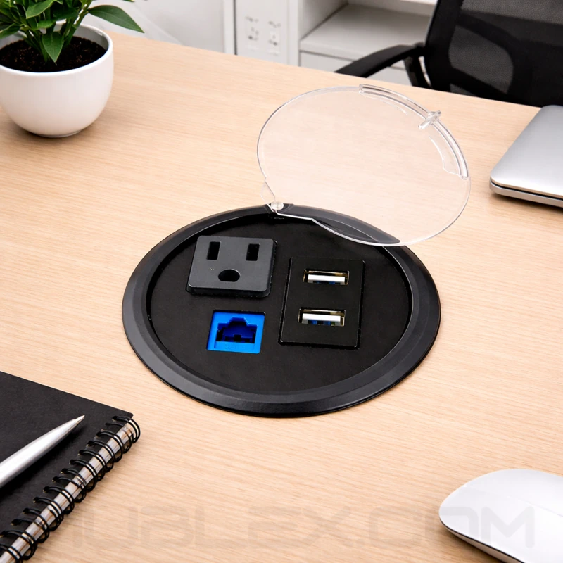 La multitoma redonda para incrustar es una solución compacta diseñada para integrar conexiones eléctricas y de datos directamente en mesas de juntas, escritorios y superficies de trabajo. Su formato circular permite una instalación discreta mediante sistema roscado, optimizando el uso del espacio y facilitando el acceso a conectividad en entornos corporativos donde se requiere funcionalidad sin afectar la estética del mobiliario.