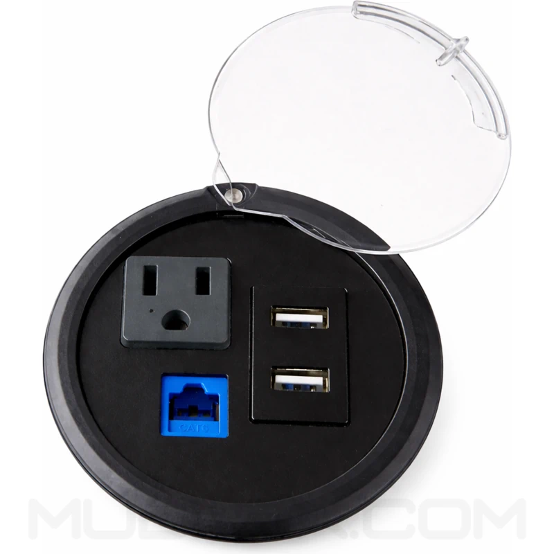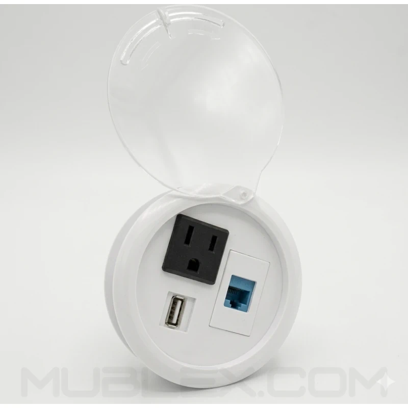 Caja multitoma redonda de incrustar diseñada para mesas de juntas, escritorios y superficies de trabajo que requieren soluciones compactas de conectividad. Su formato circular permite una integración discreta en el mobiliario, facilitando el acceso a conexiones eléctricas y de datos en espacios corporativos o de oficina. Ofrece configuración de 1 toma corriente tipo chasis, 1 USB de carga tipo A + 1 datos 6A y una tapa superior transparente. Optimizando la organización del cableado y el uso eficiente del espacio. Su sistema de fijación mediante rosca asegura estabilidad y adaptación a diferentes espesores de superficie.