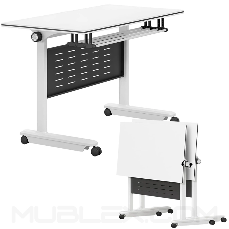 Su mecanismo de plegado con palanca automática permite abatir la superficie de forma rápida y sencilla, facilitando que varios escritorios se aniden y se almacenen verticalmente, ahorrando espacio en oficinas, aulas o salas de conferencias.