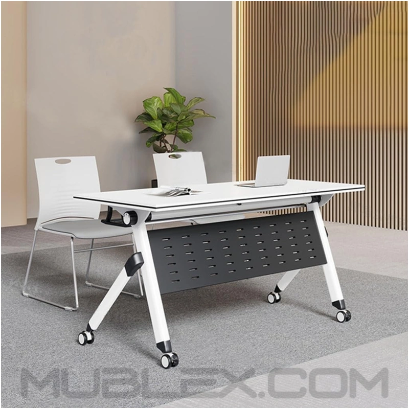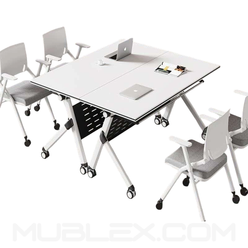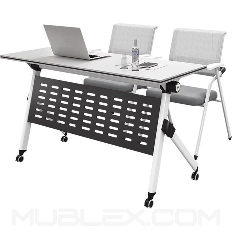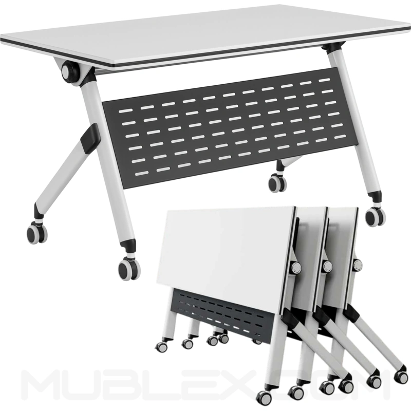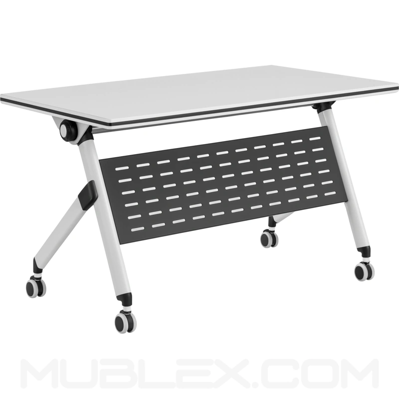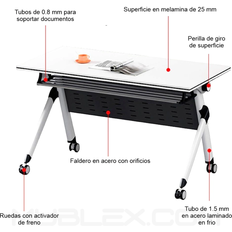 Su mecanismo de plegado con palanca automática permite abatir la superficie de forma rápida y sencilla, facilitando que varios escritorios se aniden y se almacenen verticalmente, ahorrando espacio en oficinas, aulas o salas de conferencias.