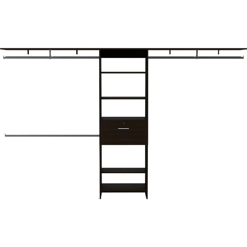 Closet, con 3 tubos cromados para colgar ropa y cajón con cerradura metálica.