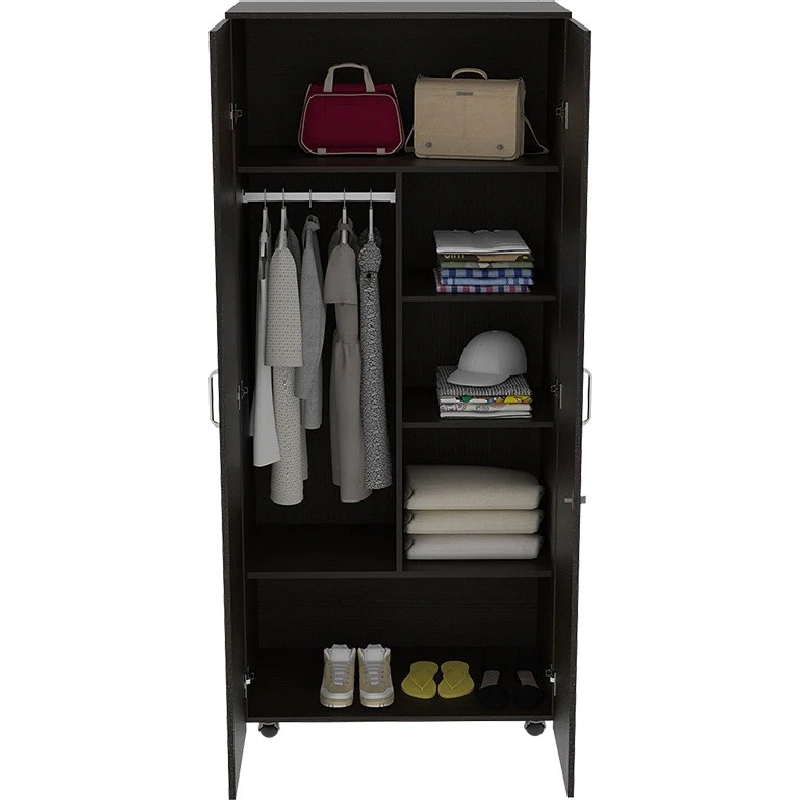 Closet, con 2 puertas abatibles, tubo cromado para colgar ropa, rodachinas para su fácil desplazamiento, incluye cerradura para puerta y pasador, compartimiento inferior y superior para organizar ropa, zapatos u accesorios.