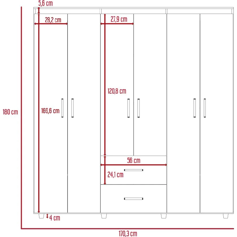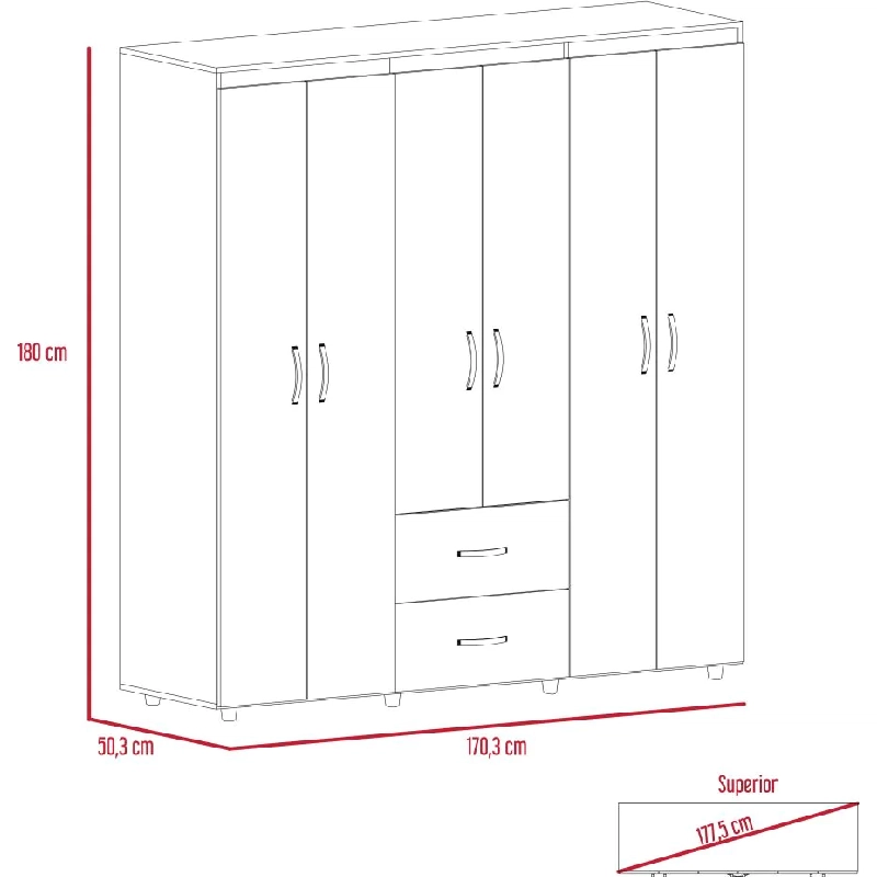 Closet, con amplios espacios y entrepaños para organizar, 6 puertas abatibles, 2 tubos cromados, 2 cajones organizadores, y deslizadores de plástico para apoyo al piso.