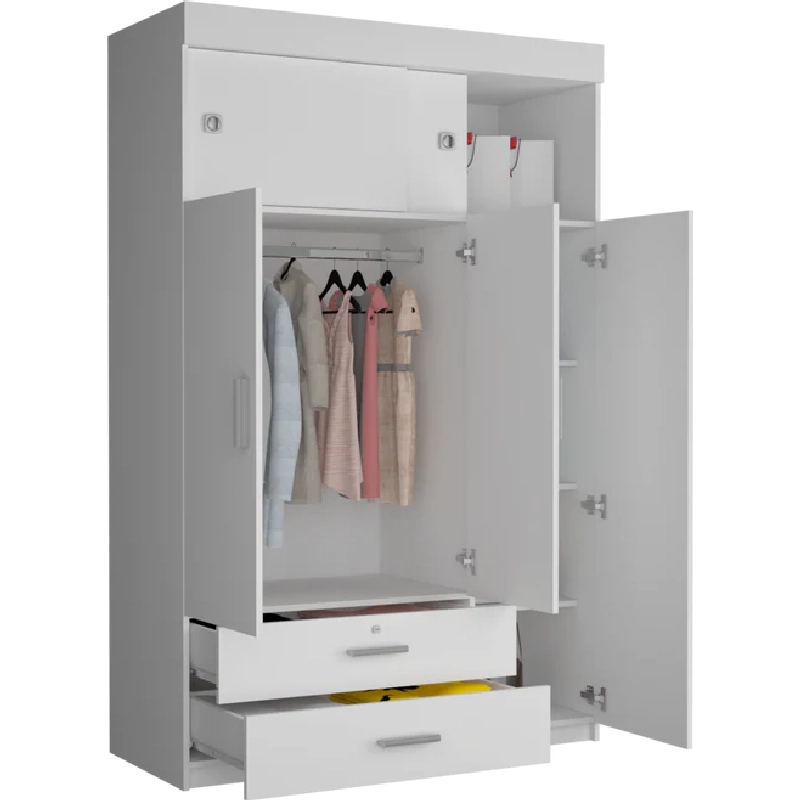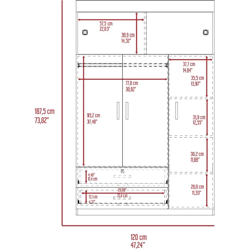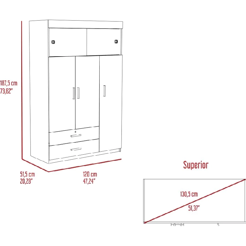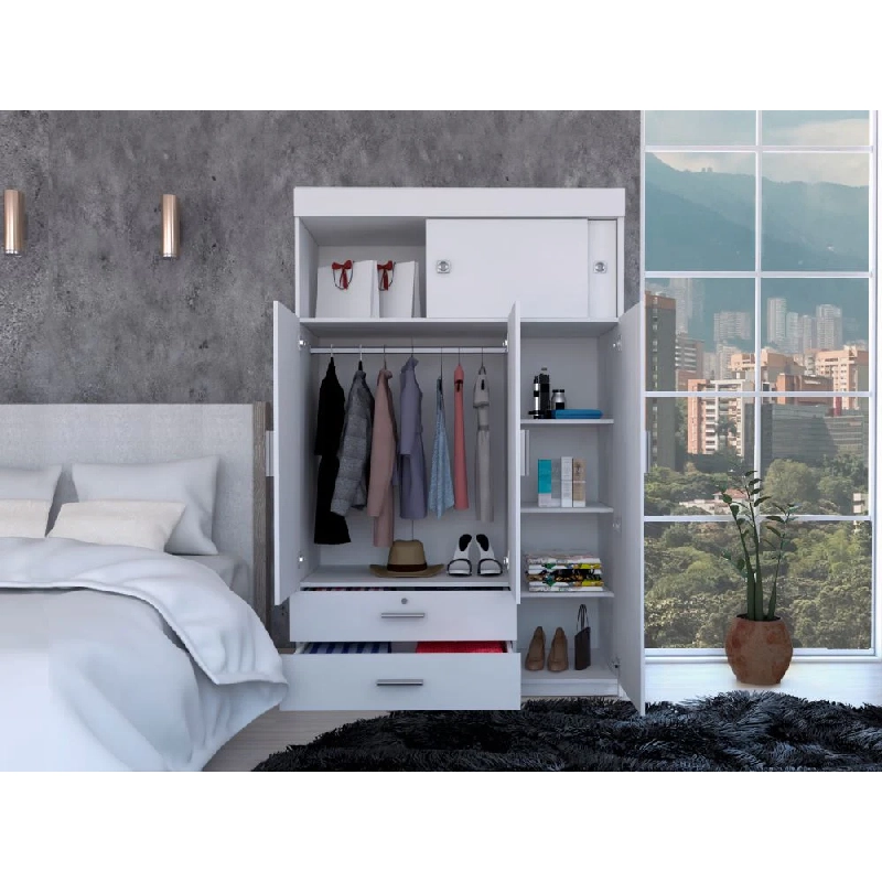 Closet, con 1 tubo cromado para colgar ropa, 2 puertas deslizables, 3 puertas batientes, 2 cajones organizadores, manijas metálicas y variedad de entrepaños.
