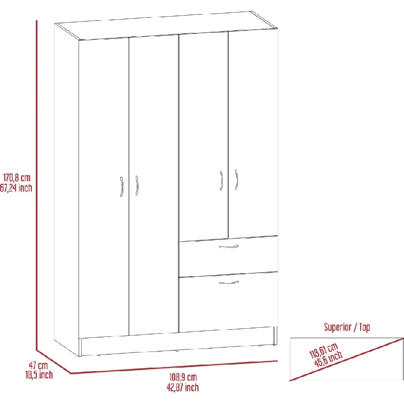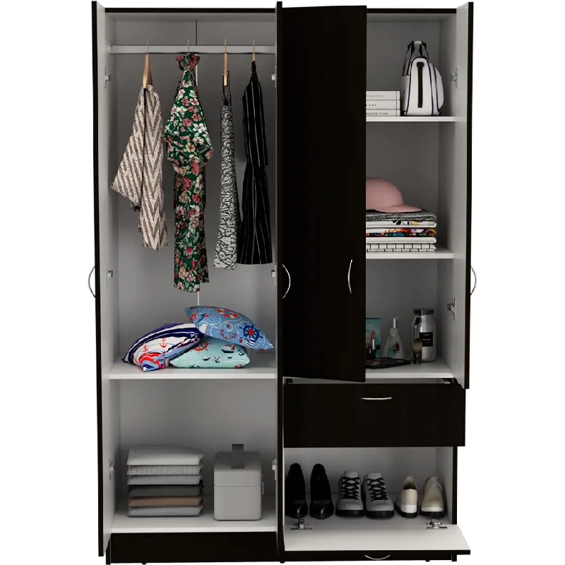 Closet, con cuatro puertas batientes, un cajón y un tubo para colgar ropa.