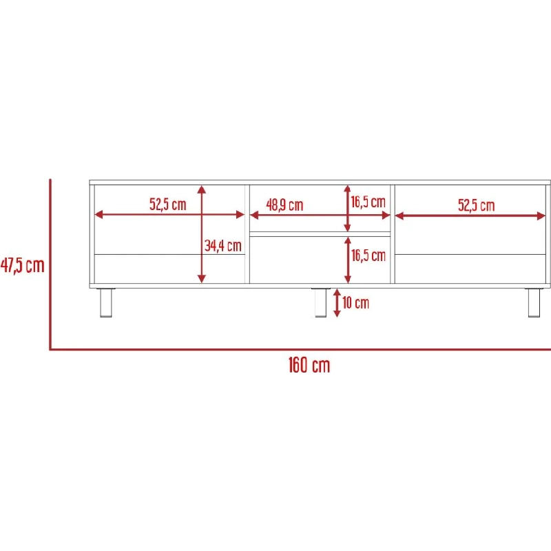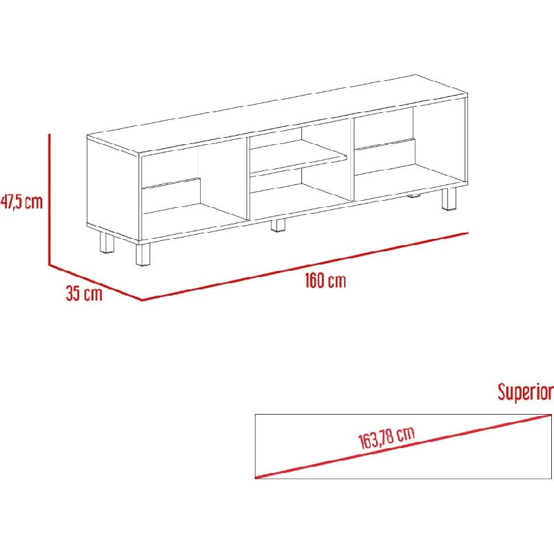 Mesa para TV de 70″. cuenta con un entrepaño y cuatro compartimentos para almacenar objetos.