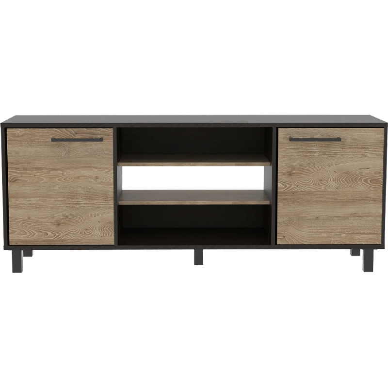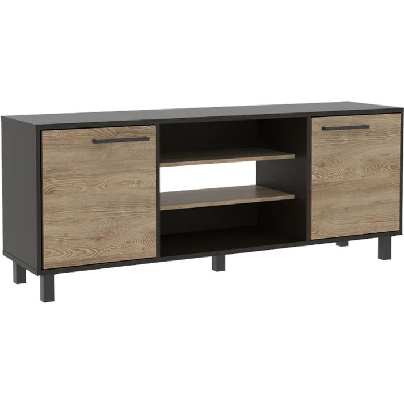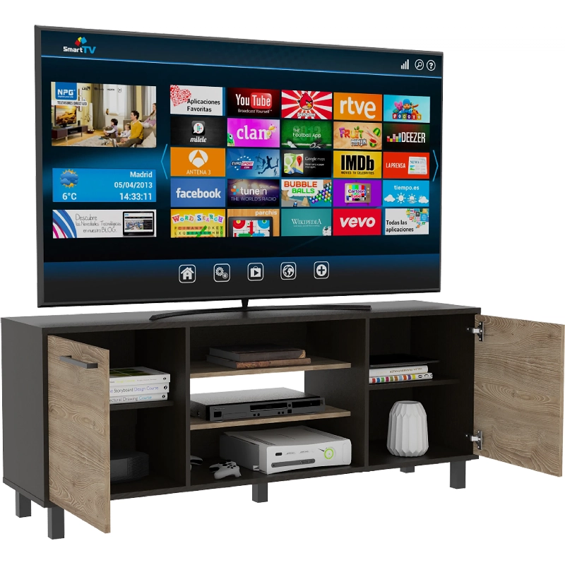 Mesa para TV, con espacio para televisor de 65″, patas en acero, y espacio inferior para colocar objetos decorativos y equipos de audio y video.