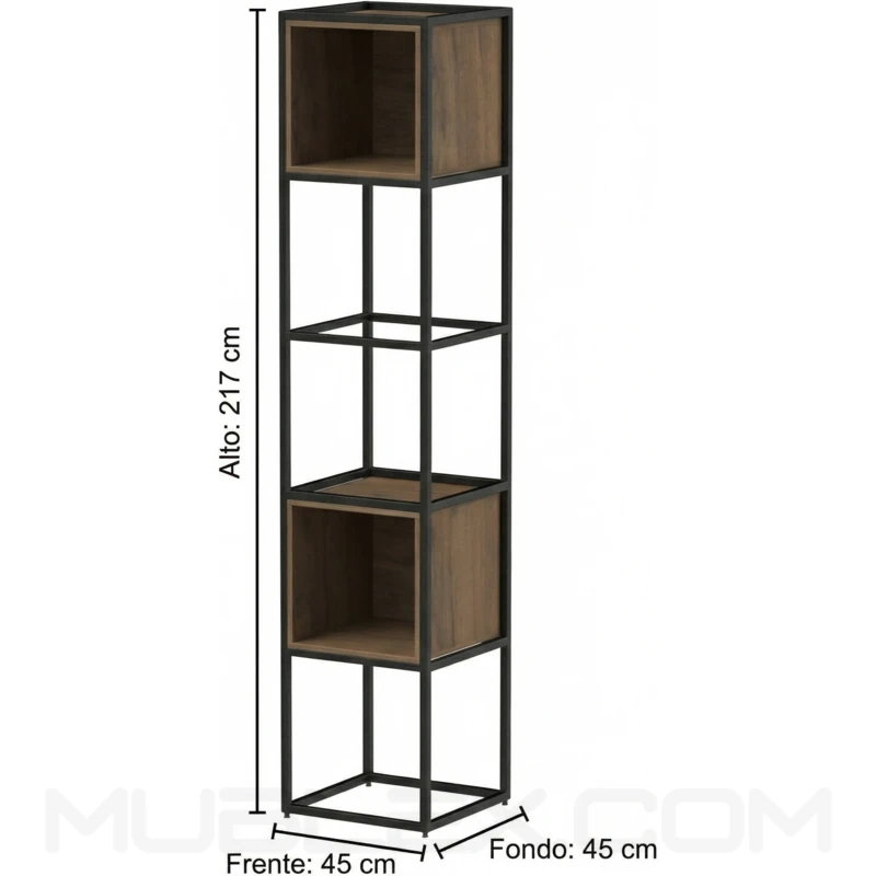 Estante Block de diseño industrial y minimalista, ideal para organizar espacios modernos. Estructura vertical fabricada en metal resistente color: Pintura electrostática, negro, gris claro (tornado),gris oscuro (nopal). Otros colores aumentan el 7% cubos en madera color a elección de acuerdo a catálogo y sujeto a disponibilidad, cuatro niveles de almacenamiento. Incluye cubos de madera con vetas naturales que aportan calidez y contraste. Su formato compacto permite optimizar el espacio en salas u oficinas, combinando estantes abiertos con nichos cerrados para una decoración versátil y funcional.